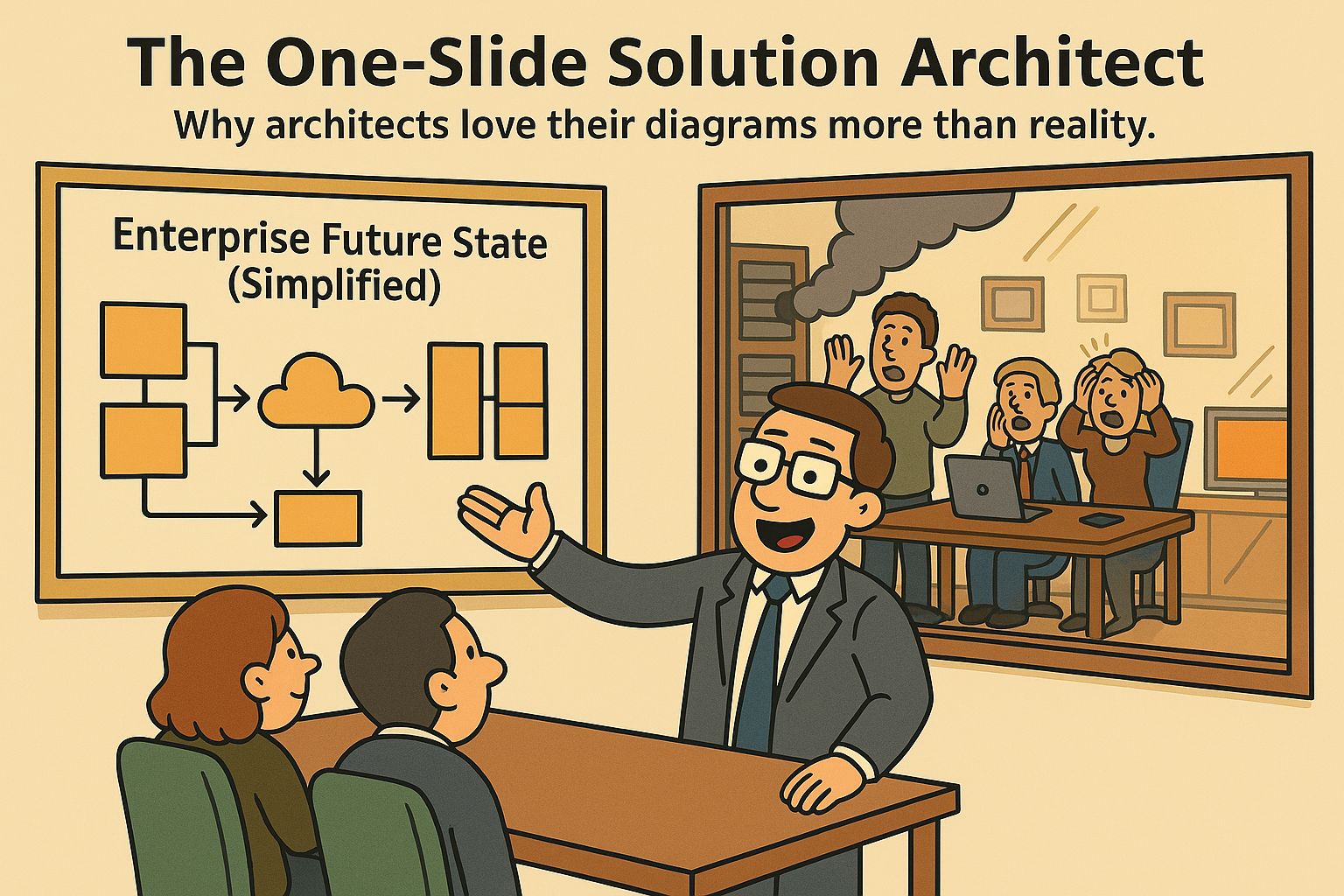 This week, we journey into the land of immaculate slide decks — where arrows align perfectly, cloud icons sparkle, and the One-Slide Solution Architect reigns supreme.